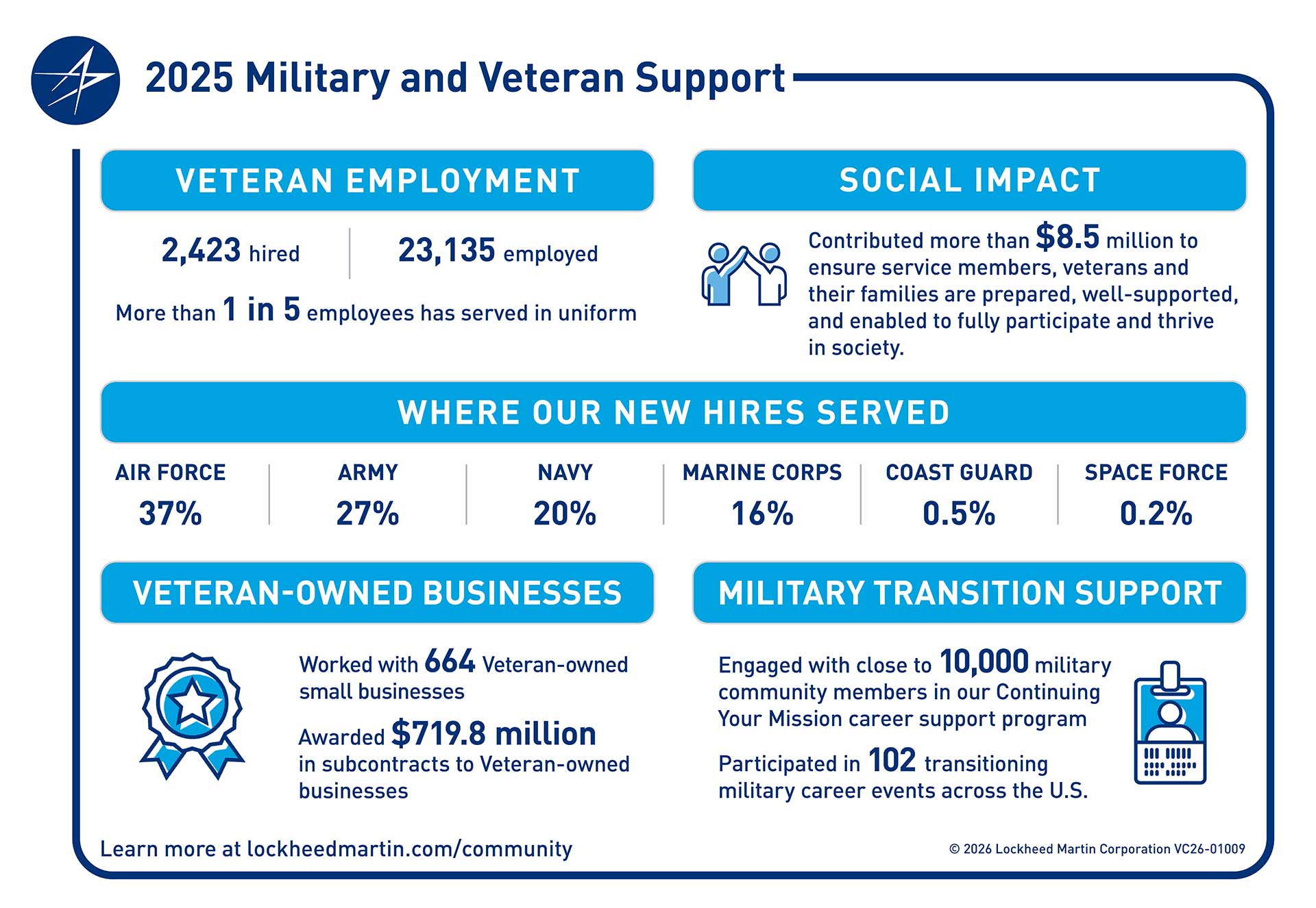 At Lockheed Martin, veterans are at the center of everything we do — in fact, one in five of our employees has served in uniform. We are proud to help our brave service members successfully transition into civilian careers.