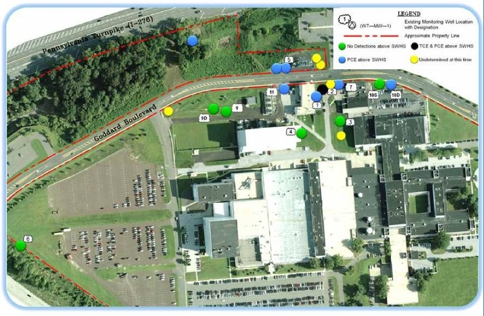April 2007 - Testing determined that the PCE had not spread to soil beyond the tank area. A groundwater investigation was initiated after it was determined that PCE concentrations in bedrock exceeded Pennsylvania regulatory standards.